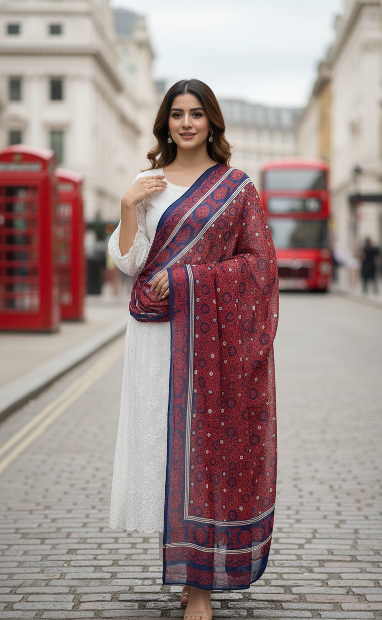 Ladies Ajrak Chiffon Dupatta – Lightweight Red & Navy Hand-Blocked Scarf