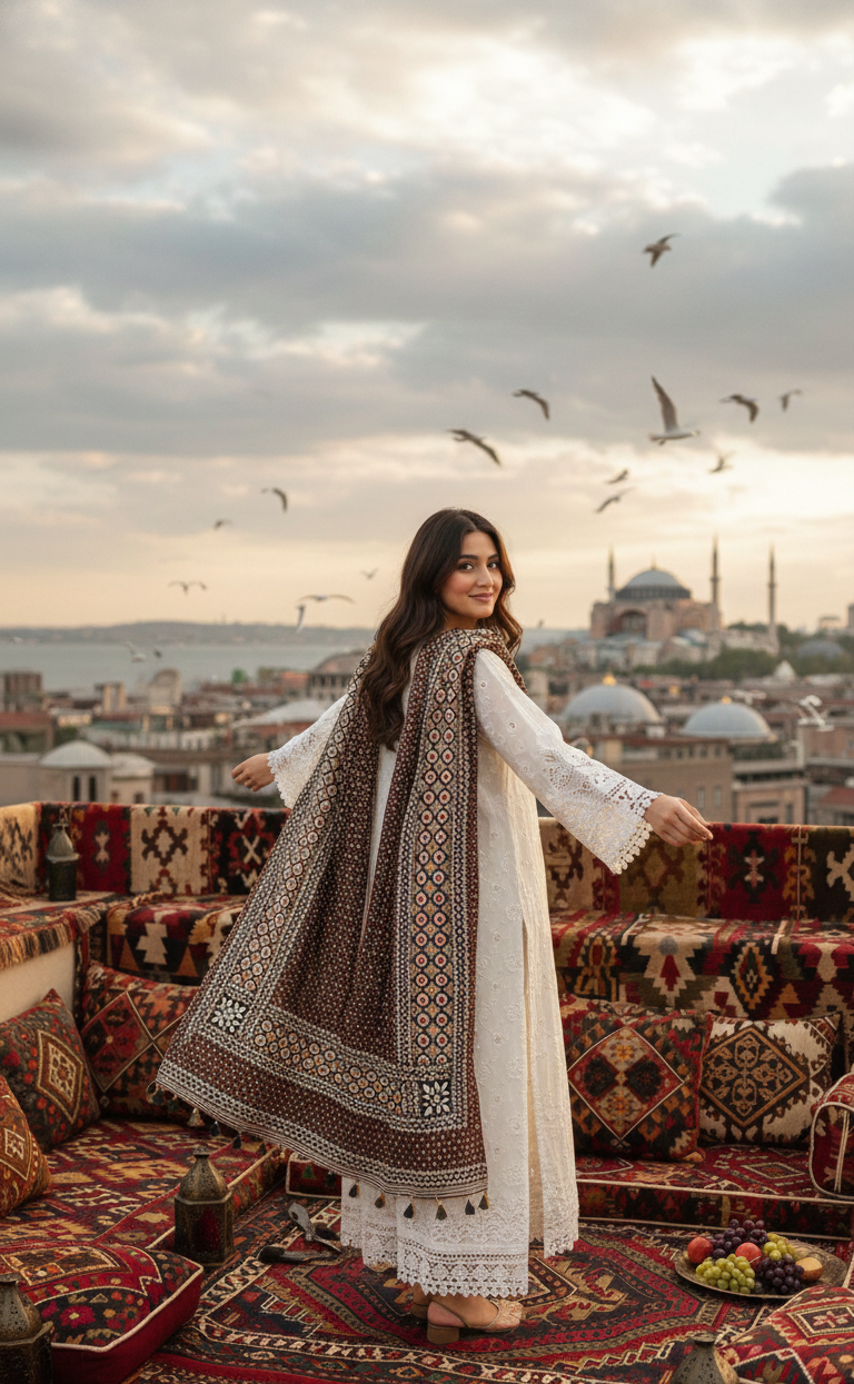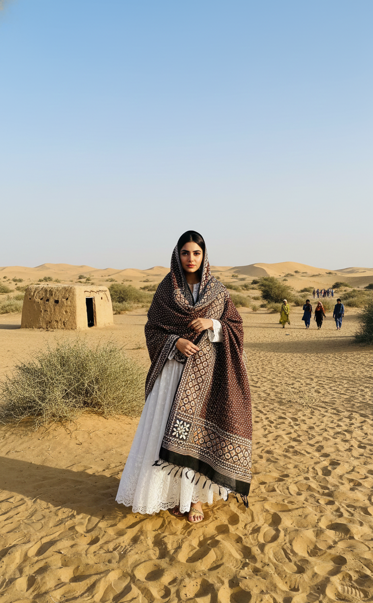 A sophisticated and timeless piece: this deep chocolate brown Ajrak dupatta is hand-block printed by Sindhi artisans using traditional wooden blocks. The intricate multicolour detailing in cream, red, yellow and black creates a stunning contrast that looks expensive and unique.