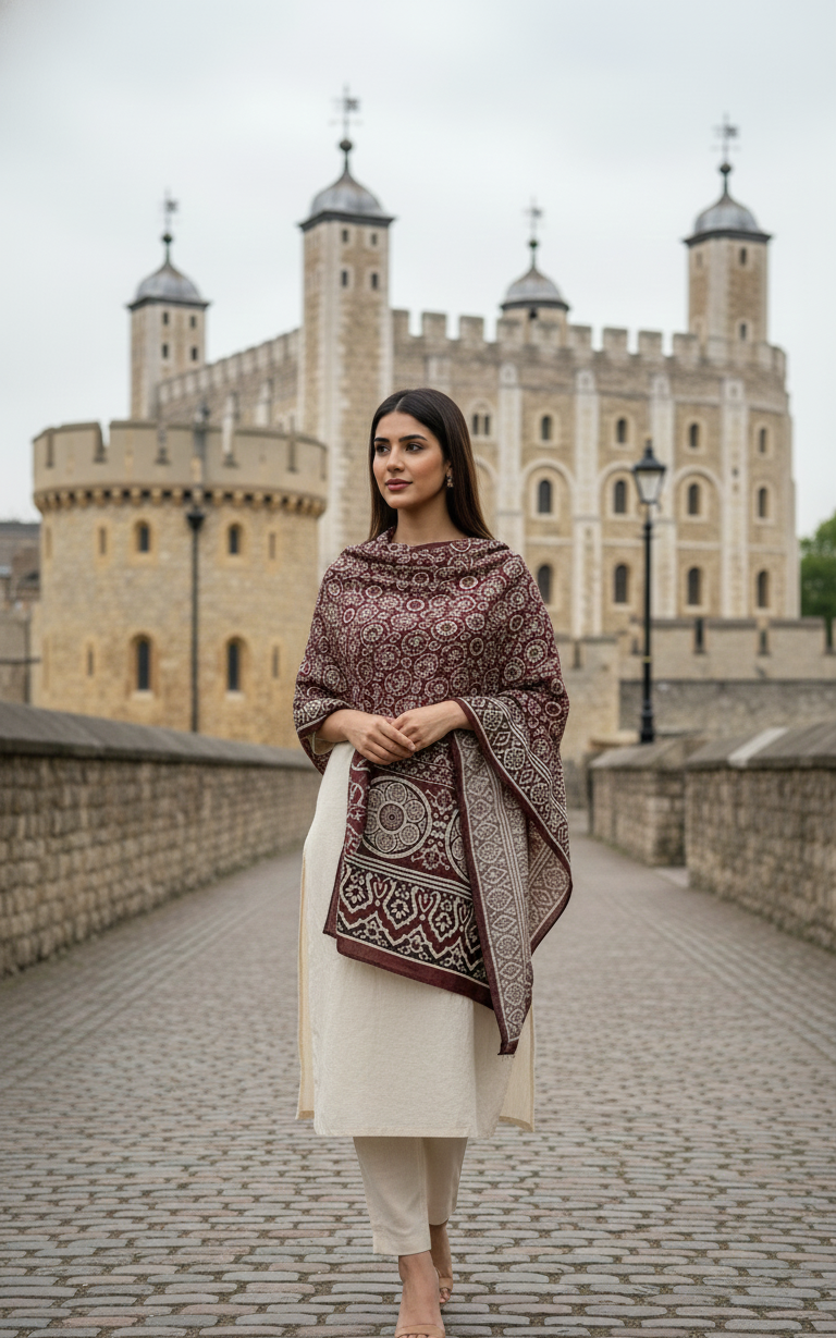 Ladies Linen Ajrak Shawl – Premium Maroon & Cream Hand-Blocked Dupatta Original price was: £26.00.Current price is: £22.00.