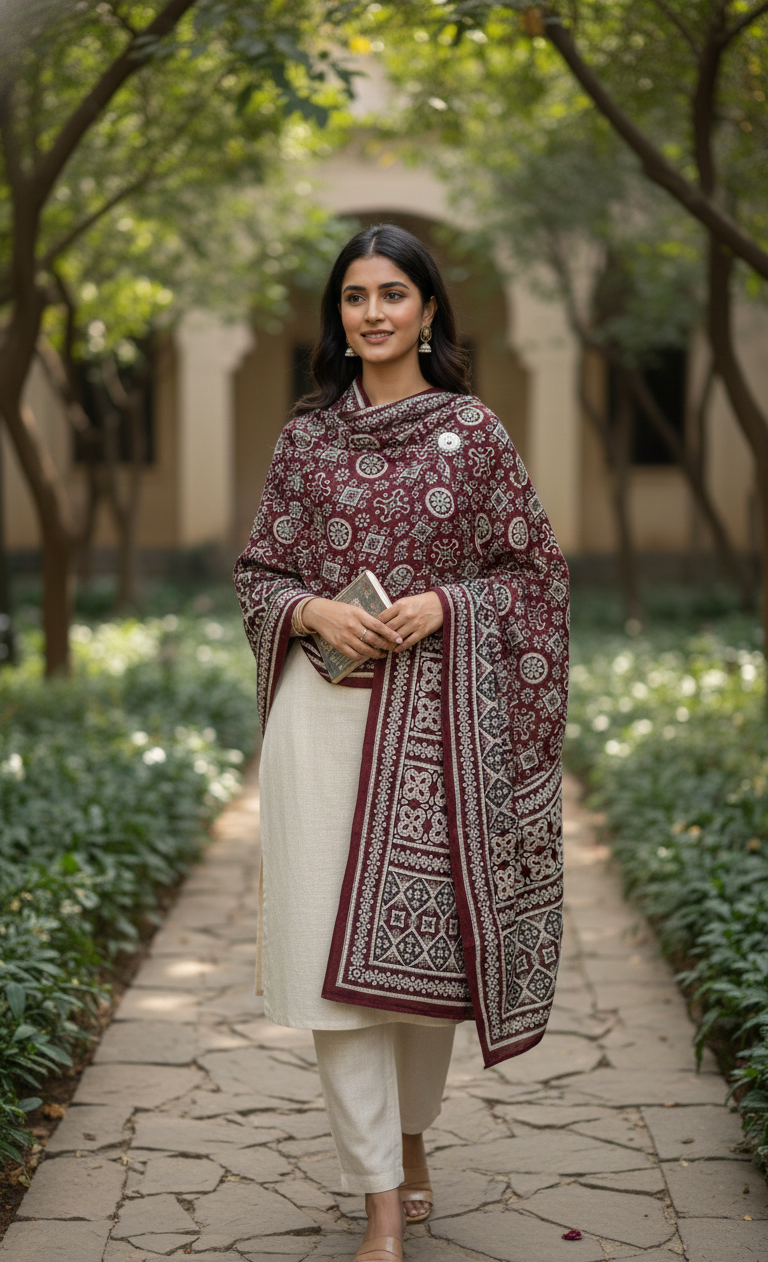 Gorgeous 100% pure linen Ajrak shawl specially made for ladies who want luxury + tradition. Hand-block printed by Sindhi artisans in the most elegant maroon & cream colour combination – lightweight, breathable and perfect drape.